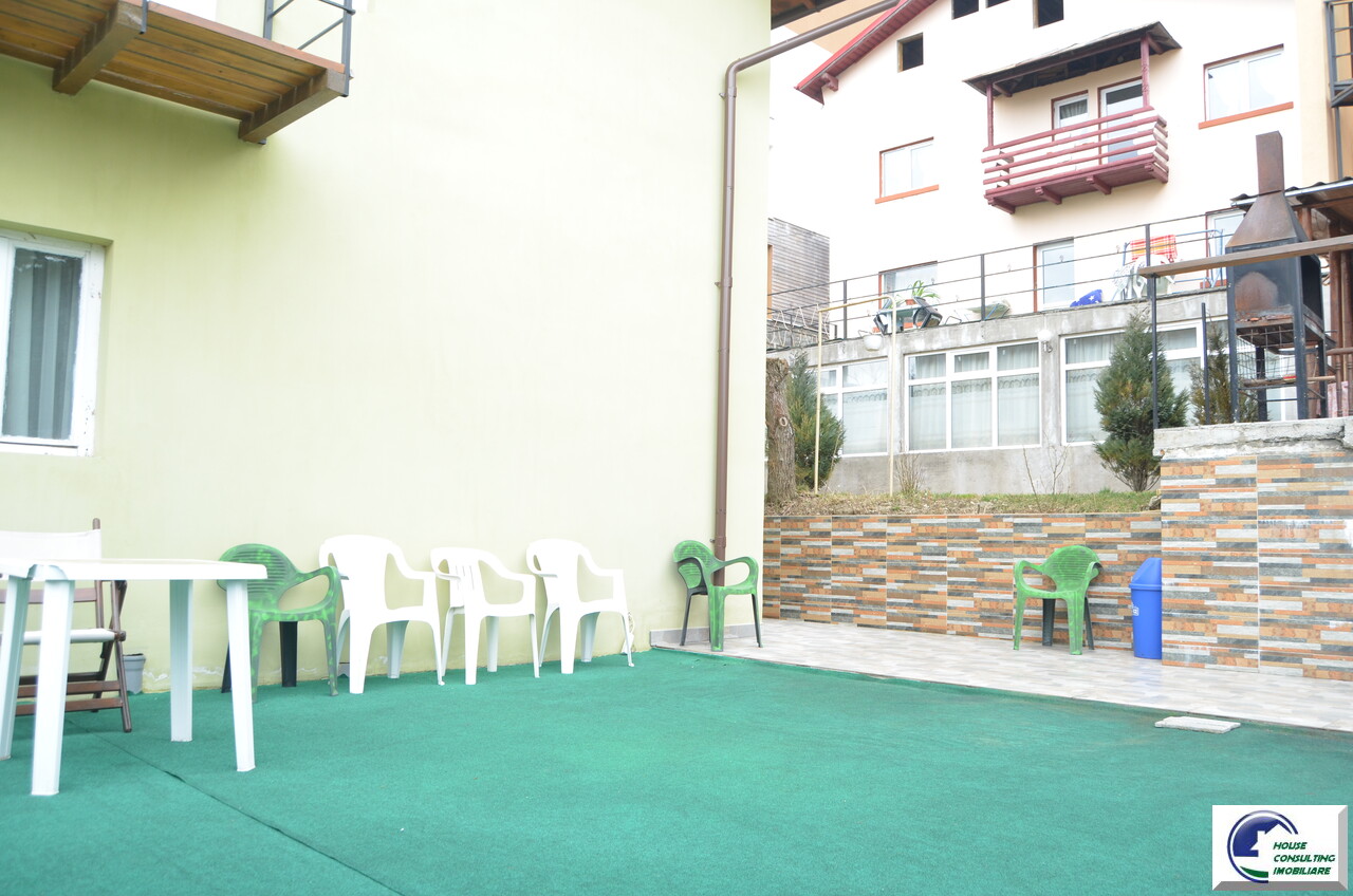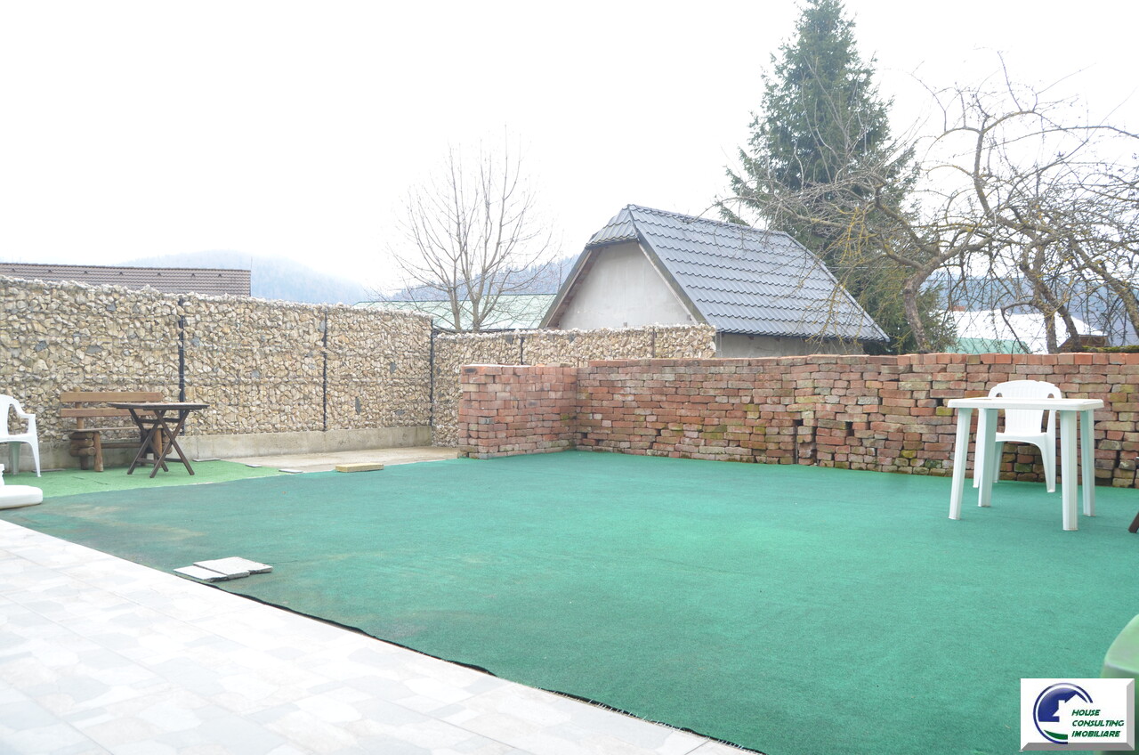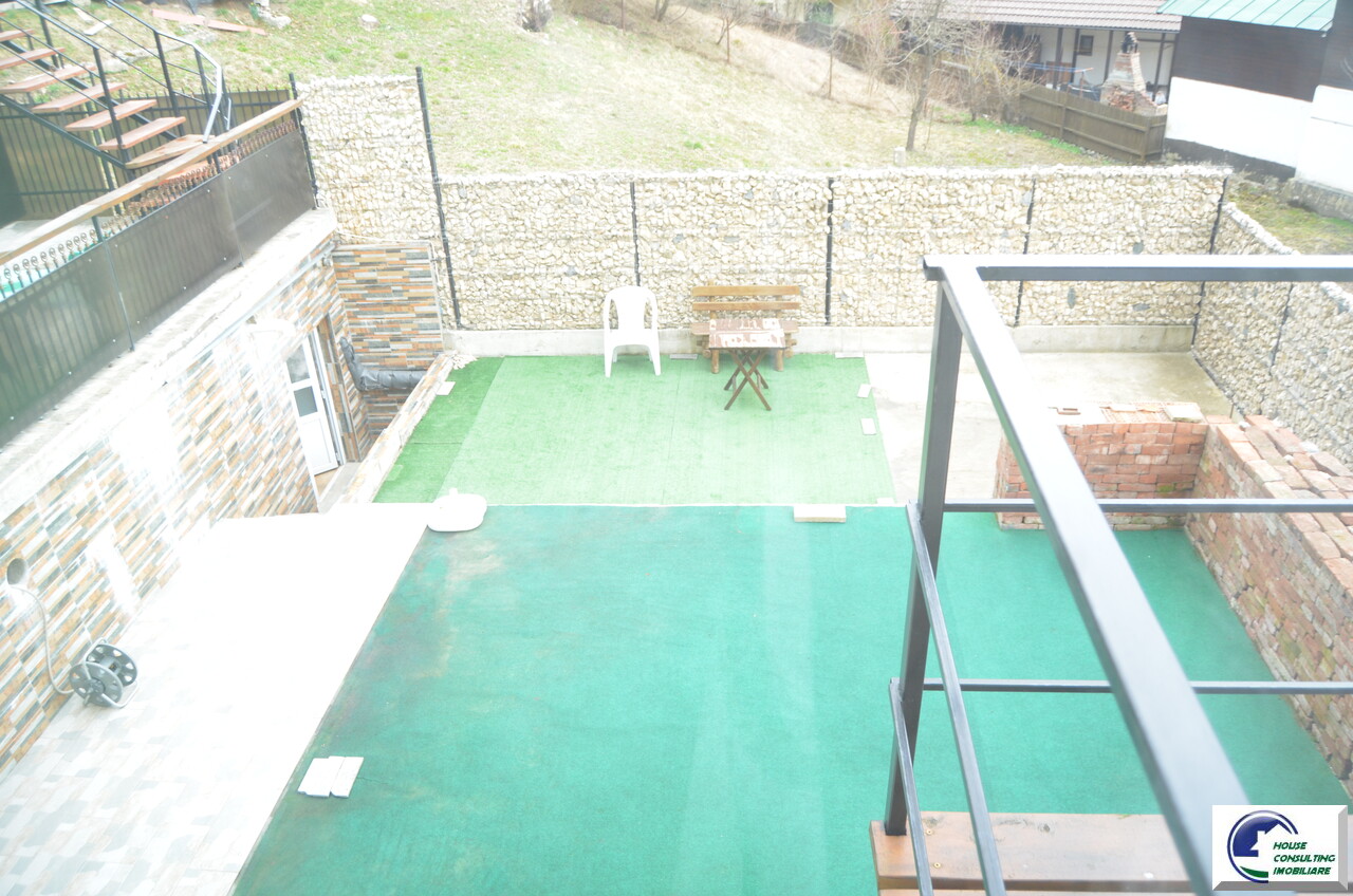 Teren: 186 mp, o suprafață de teren bine impartita avand si o terasa cu o panorama frumoasa catre Castelul Cantacuzino si Muntii Baiu, ceea ce asigură intimitate și spațiu verde.