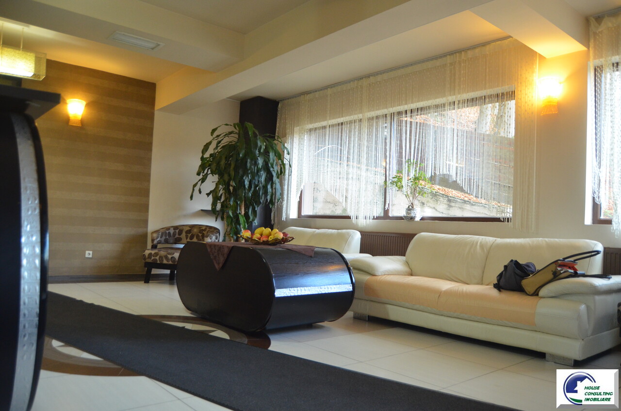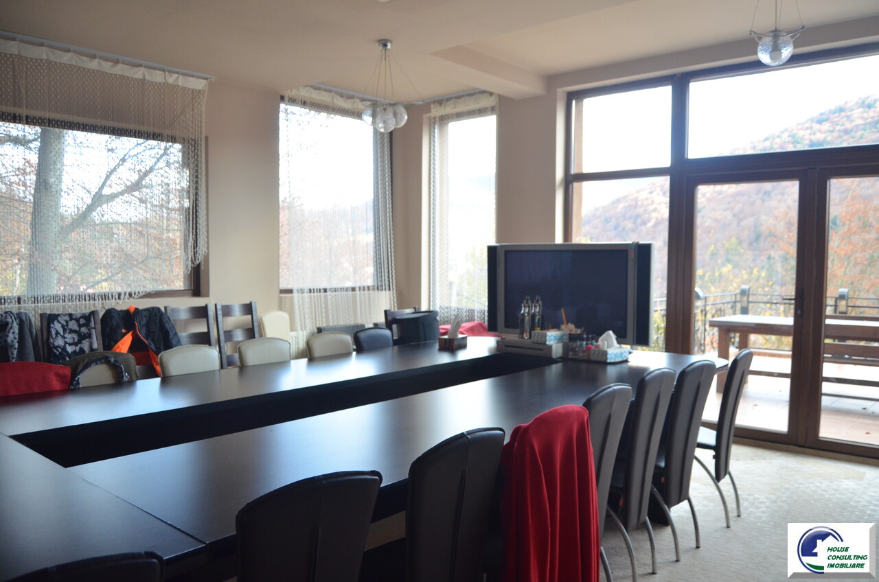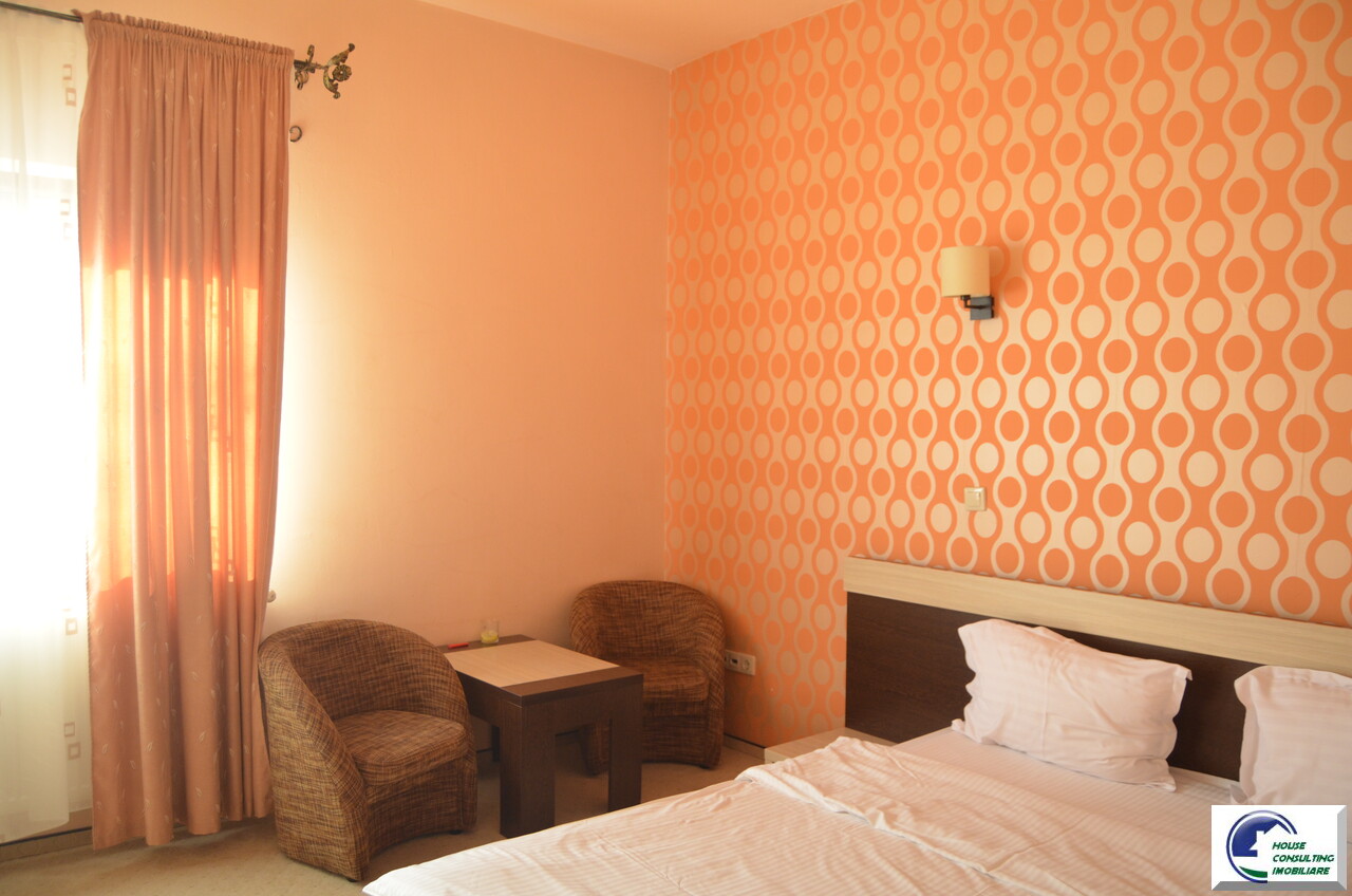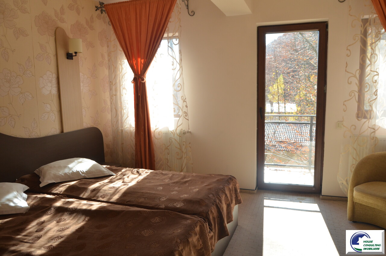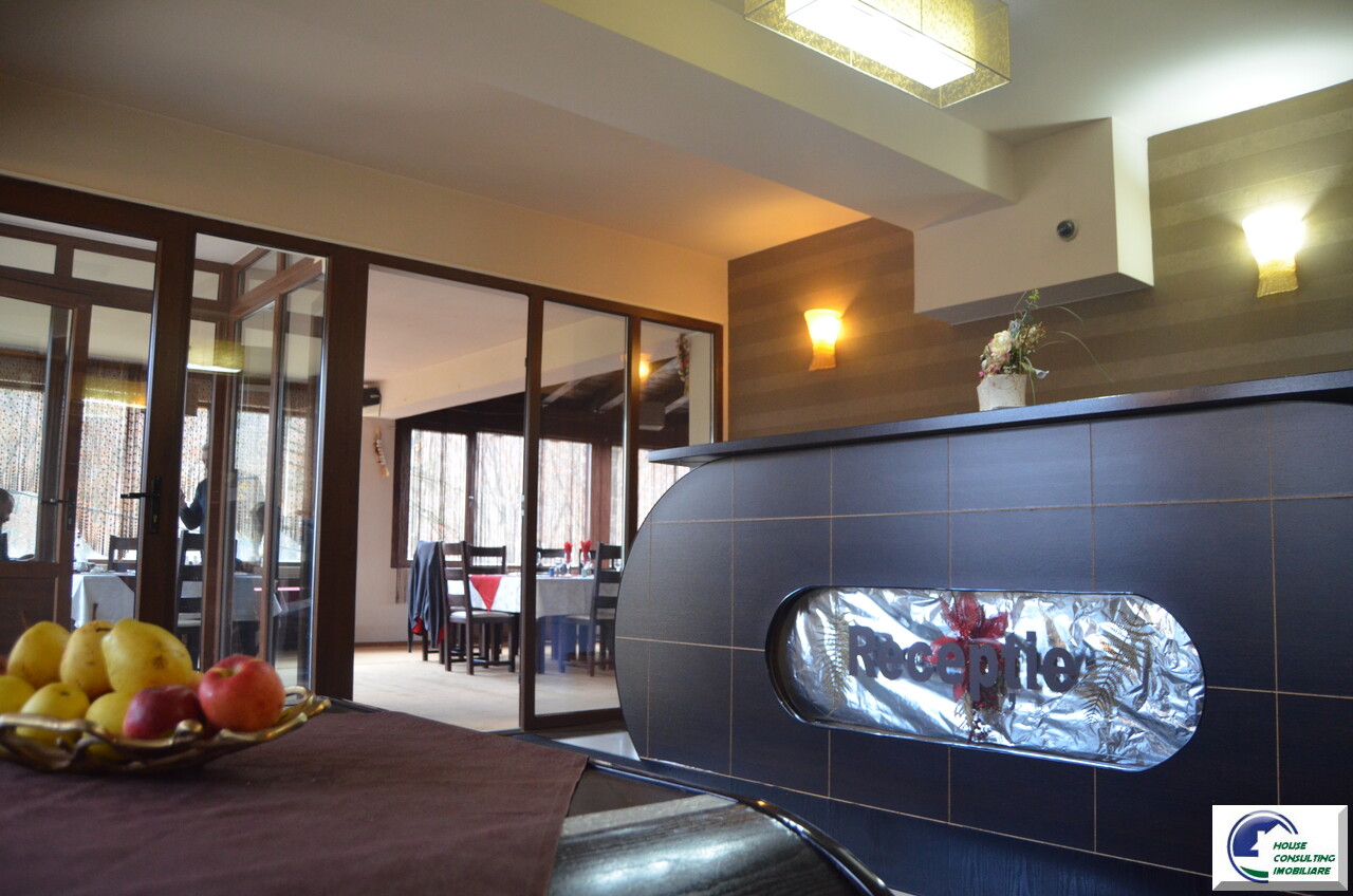 Proprietatea dispune de 18 camere matrimoniale ,un apartament cu 2 camere, toate mobilate, cu baie proprie, TV, minifrigider,balcoane.Bucatarie utilata complet, iar livingul/ restaurantul (de cca 90 mp) poate gazdui aproximativ 40 de persoane.Centrul spa prevazut cu jacuzzi si sauna,camere dus ,baie si sala de conferinta.In spate, in suprafata de aproximativ 100 mp, regasim o terasa deschisa, unde se afla gratarul si un loc de joaca pentru copii ,zona loby .Parcare proprie (aproximativ 8 locuri).
